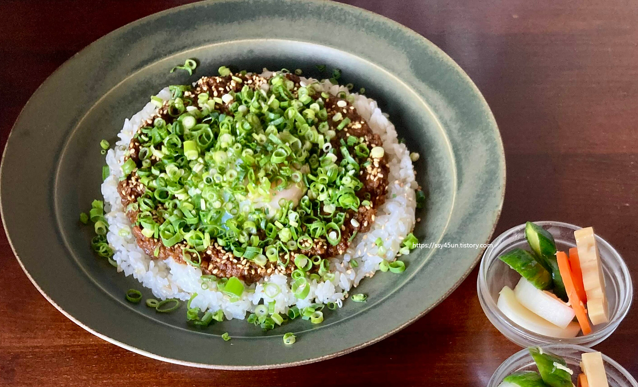 다진 고기, 수란, 치즈, 쪽파가 들어가요