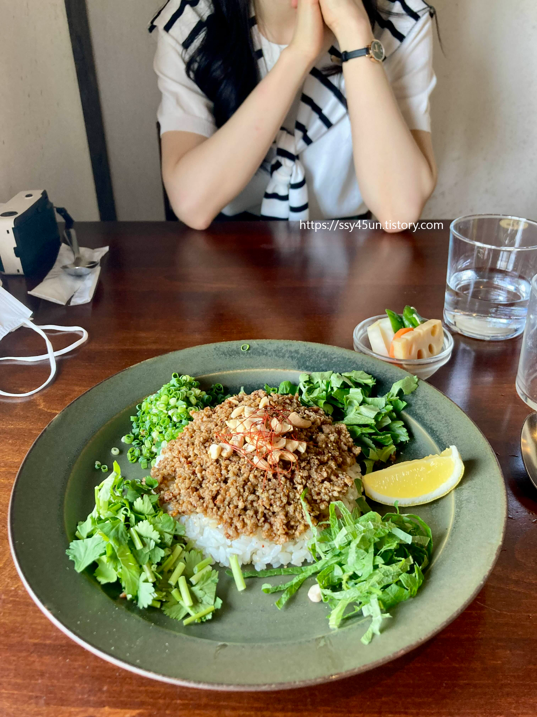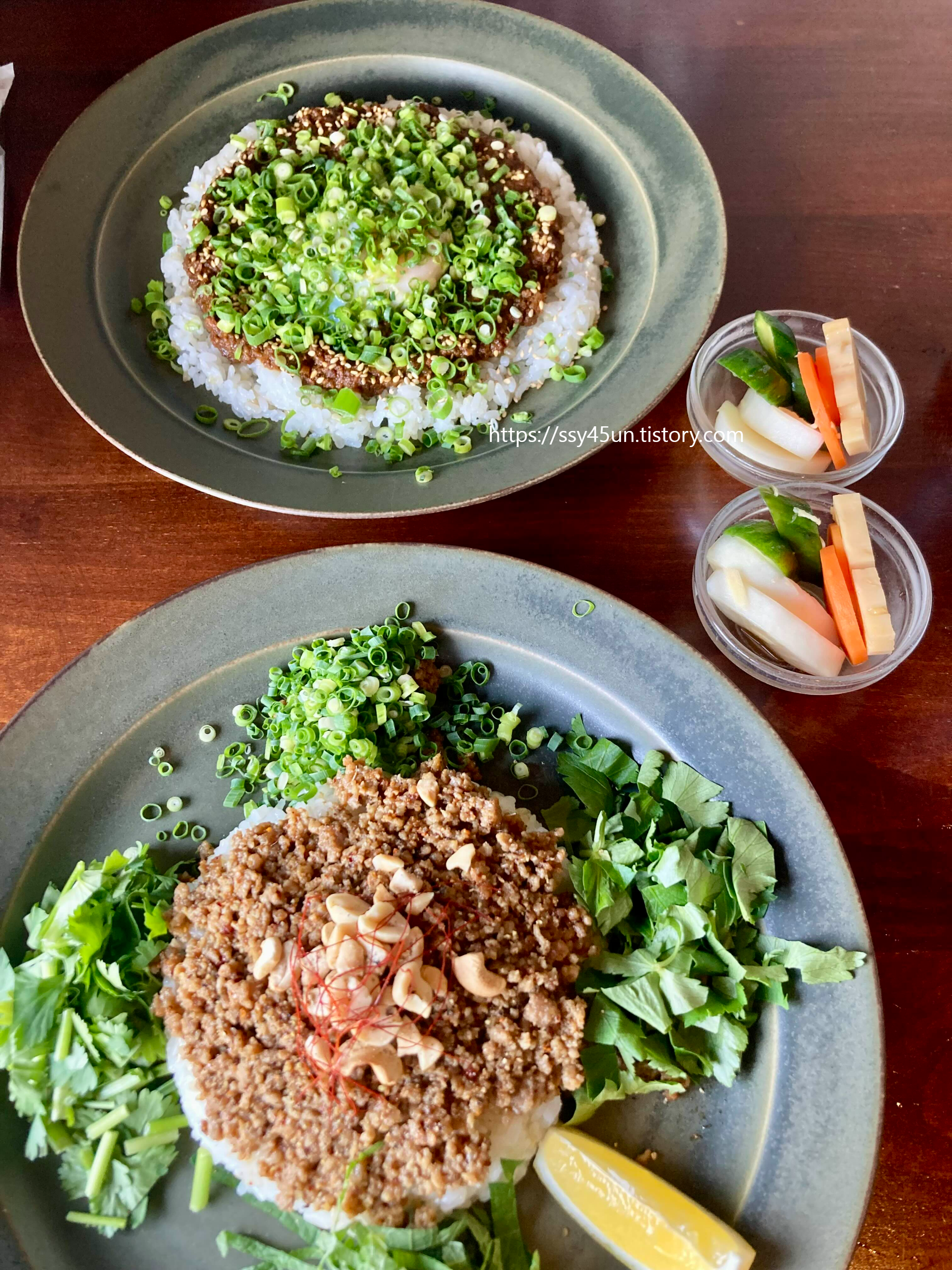 견과류, 다진 고기, 고수, 일본 깻잎이 들어가요