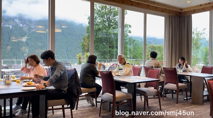 조식을 먹으러 식당으로 내려갔는데, 통창으로 보이는 아이거뷰가 너무 아름다워서 한번 더 깜짝 놀랐어요